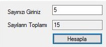 Örnek 7: Bu örnekte kullanıcıdan bir aldıktan sonra 0’dan başlayarak kullanıcının girdiği sayıya kadar olan sayıları toplatıyoruz.Kullanıcıdan aldığımız bir sayıyı ilk önce değişkene atayıp daha sonra for döngüsü kullanarak toplam değişkenine aktarıp textbox içine yazdırıyoruz.