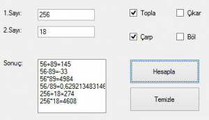 1 2 3 4 5 6 7 8 9 10 11 12 13 14 15 16 17 18 19 20 21 22 23 24 25 26 27 28 29 30 31 32 33 34 35 36 37 38 39 40 41 42 43 44 45 46 | private void buttonHesapla_Click(object sender, EventArgs e) { double sayi1 = Convert.ToDouble(textBoxSayi1.Text); //TextBox'ta alınan sayıyı Double tipine çeviriyoruz double sayi2 = Convert.ToDouble(textBoxSayi2.Text); //TextBox'ta alınan sayıyı Double tipine çeviriyoruz if (checkBoxTopla.Checked == true) {//Eğer topla checkbox'u seçili ise aşağıdaki işlemleri yaptırıyoruz. double sonuc = sayi1 + sayi2; //toplama işlemini sonuc değişkeninde yaptırıyoruz. listBox1.Items.Add(sayi1 + "+" + sayi2 + "=" + sonuc); //Ve sonucu listbox'a yazdırıyoruz. } if (checkBoxCikar.Checked == true) {//Eğer cikar checkbox'u seçili ise aşağıdaki işlemleri yaptırıyoruz. double sonuc = sayi1 - sayi2; //Çıkarma işlemini sonuc değişkeninde yaptırıyoruz. listBox1.Items.Add(sayi1 + "-" + sayi2 + "=" + sonuc); //Ve sonucu listbox'a yazdırıyoruz. } if (checkBoxCarp.Checked == true) {//Eğer carp checkbox'u seçili ise aşağıdaki işlemleri yaptırıyoruz. double sonuc = sayi1 * sayi2; //Çarpma işlemini sonuc değişkeninde yaptırıyoruz. listBox1.Items.Add(sayi1 + "*" + sayi2 + "=" + sonuc); //Ve sonucu listbox'a yazdırıyoruz. } if (checkBoxBol.Checked == true) {//Eğer bol checkbox'u seçili ise aşağıdaki işlemleri yaptırıyoruz. double sonuc = sayi1 / sayi2; //Çıkarma işlemini sonuc değişkeninde yaptırıyoruz. listBox1.Items.Add(sayi1 + "/" + sayi2 + "=" + sonuc); //Ve sonucu listbox'a yazdırıyoruz. } } private void buttonTemizle_Click(object sender, EventArgs e) { listBox1.Items.Clear(); //Listbox'u temizliyoruz. } |