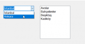 1 2 3 4 5 6 7 8 9 10 11 12 13 14 15 16 17 18 19 20 21 22 | private void comboBox1_SelectedIndexChanged(object sender, EventArgs e) { listBox1.Items.Clear(); if(comboBox1.SelectedIndex==0) { listBox1.Items.Add("Avcılar"); listBox1.Items.Add("Bahçelievler"); listBox1.Items.Add("Beşiktaş"); listBox1.Items.Add("Kadıköy"); } else if(comboBox1.SelectedIndex==1) { listBox1.Items.Add("Etimesgut"); listBox1.Items.Add("Yenimahalle"); listBox1.Items.Add("Çankaya"); listBox1.Items.Add("Keçiören"); } } |