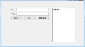 Ekle Butonuna basıldığında girilen ad ve soyad bilgisinin birleştirilerek listBox’ a eklenmesini, ekleme işlemi tamamlandıktan sonra textbox içeriklerinin temizlenmesini sağlayalım.