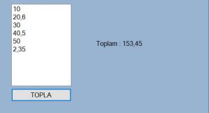 1 2 3 4 5 6 7 8 9 10 11 | private void button1_Click(object sender, EventArgs e) { double toplam = 0; for(int i=0;i<listBox1.Items.Count;i++) { toplam += Convert.ToDouble(listBox1.Items[i]); } label1.Text = "Toplam : " + toplam; } |