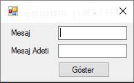 1 2 3 4 5 6 7 8 9 10 11 12 13 14 15 | private void button1_Click(object sender, EventArgs e) { string mesaj = Convert.ToString(textBox1.Text); //Mesaj değişkenimizi belirlirleyip textbox1'e girilen mesajı değişkene atıyoruz. int mAdet = Convert.ToInt16(textBox2.Text); //Mesaj adeti değişkenimizi belirleyip textbox2'ye girilen mesajı değişkene atıyoruz. for (int i = 1 ; i <= mAdet; i++)//girilen sayıya kadar dönen döngü oluşturuyoruz. { MessageBox.Show(+i +"-" +mesaj);//Mesajı messagebox'a yazdırıyoruz. } } |