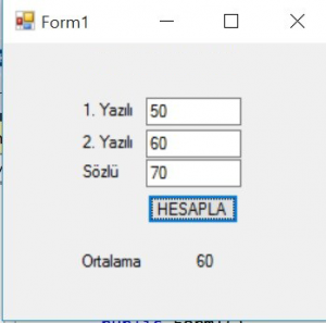 C# Windows Form ile 2 yazılı ve 1 sözlü notu girilerek Ortalamayı hesaplayıp Ekrana yazdırmak için oluşturulmuş uygulama örneği: