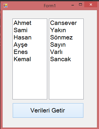 1 2 3 4 5 6 7 8 9 10 11 12 13 14 15 16 17 18 19 20 21 22 23 24 25 26 27 28 29 30 31 32 | namespace dtreader { public partial class Form1 : Form { OleDbConnection con; OleDbCommand cmd; OleDbDataReader dr; public Form1() { InitializeComponent(); } private void button1_Click(object sender, EventArgs e) { con = new OleDbConnection("Provider=Microsoft.ACE.Oledb.12.0;Data Source=personel.accdb"); cmd = new OleDbCommand(); con.Open(); cmd.Connection = con; cmd.CommandText = "SELECT * FROM kisiler"; dr = cmd.ExecuteReader(); while (dr.Read()) { listBox1.Items.Add(dr["kisi_ad"]); listBox2.Items.Add(dr["kisi_soyad"]); } con.Close(); } |