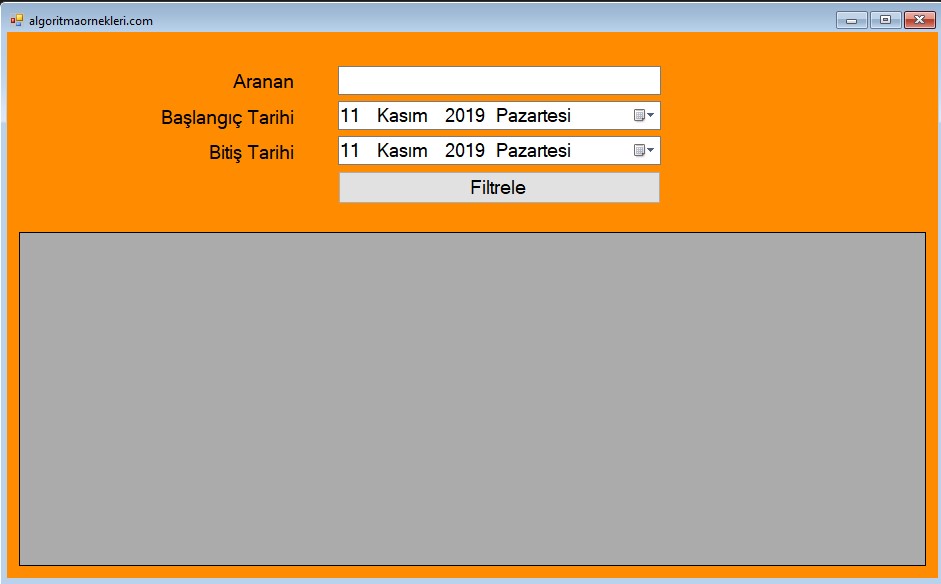 C# Windows Form ile Sql veritabanı bağlantısı kuran ve Form’ da bulunan TextBox kontrolüne girilen veriyi iki adet DateTimePicker kontrolü ile seçilen tarihler arasında filtreleyerek, filtrelenmiş kayıtları DataGridView içinde görüntüleyen örneğe ait kodlar.