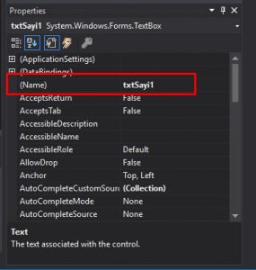 Daha sonra textBox1, textBox2 ve label3 kontrollerinin Name özelliklerini sırasıyla txtSayi1, txtSayi2 ve lblSonuc olarak değiştirelim.