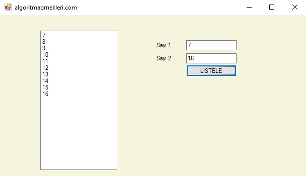 C# Windows Form ile Kullanıcıdan textBox’ lara 2 sayı girmesi istenerek girilen bu iki sayı arasındaki sayıları ListBox’ ta Listeleyen örnek...