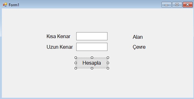 C# Windows Form ile Kısa kenarı ve uzun kenarı TextBox’ lara girilen dikdörtgenin alanı ve çevresini hesaplayaral sonucu Label içinde gösteren örneğe ait...