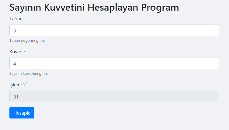 JavaScriptte Math kütüphanesi ile sayının üssünü hesaplamak mümkün fakat bu JavaScript örneğinde kütüphane kullanmadan sayının kuvvetini hesaplayan programı...