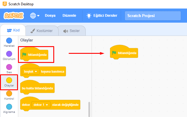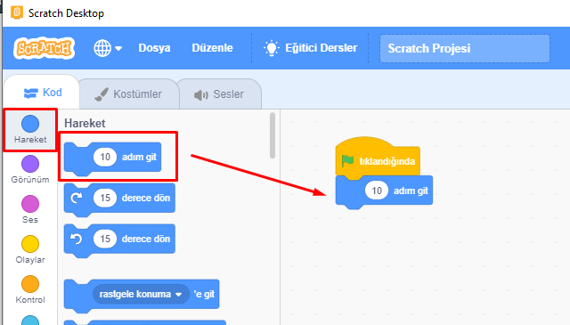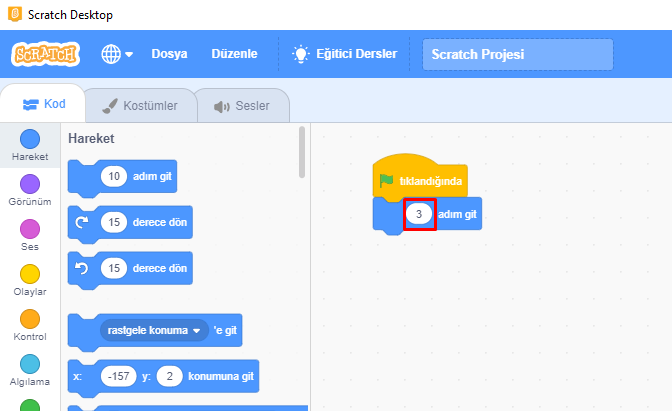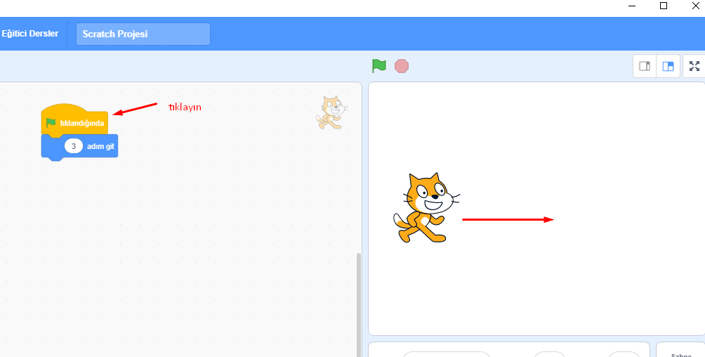 Blokları ekledikten sonra şimdi “kedi”nin hareket ettirilmesine geldi.  Yeşil bayrağa her tıkladığımızda kedi 3 adım ileri doğru hareket edecektir.