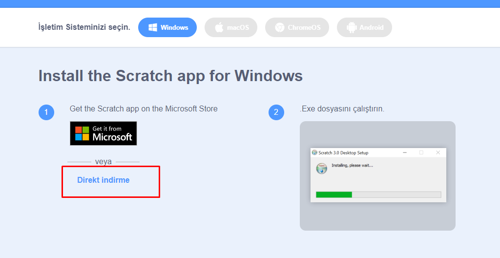 Scratch programını online kullanabileceğimiz gibi indirip de kullanabiliriz. Scratch programını indirmek için arama motoruna scrach yazmak  yada aşağıdaki bağlantıya tıklamak yeterli olacaktır.