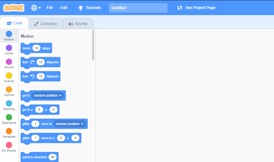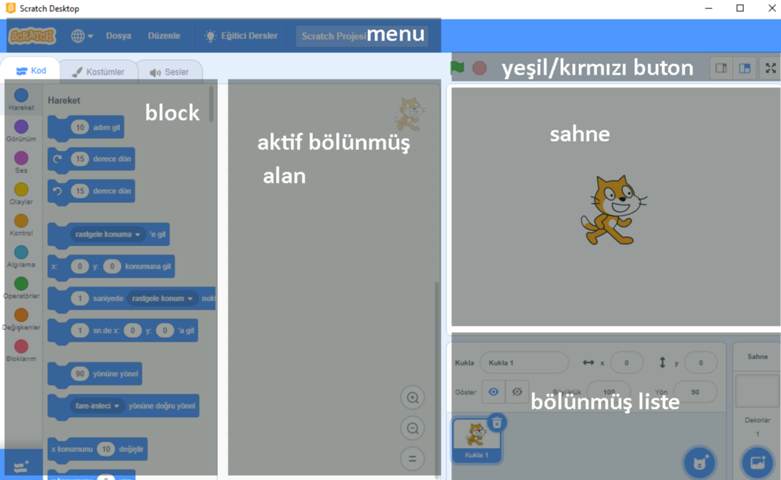 Scratch programını açtıktan sonra aşağıdaki gibi bir sahne bizi karşılayacaktır. Öncelikle sahneyi biraz inceleyip ilk basit uygulamayı hazırlayalım.