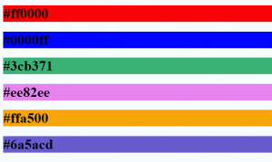 1 2 3 4 5 6 7 8 9 10 11 12 13 14 15 16 17 18 19 20 | <!DOCTYPE html> <html> <head> <meta charset="utf-8"> <meta name="description" content="css renkler"> <title>CSS Renkler</title> </head> <body> <h1 style="background-color:#ff0000;">#ff0000</h1> <h1 style="background-color:#0000ff;">#0000ff</h1> <h1 style="background-color:#3cb371;">#3cb371</h1> <h1 style="background-color:#ee82ee;">#ee82ee</h1> <h1 style="background-color:#ffa500;">#ffa500</h1> <h1 style="background-color:#6a5acd;">#6a5acd</h1> </body> </html> |