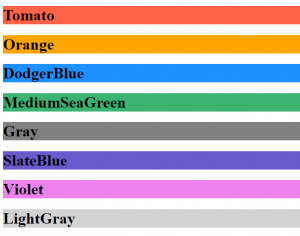 1 2 3 4 5 6 7 8 9 10 11 12 13 14 15 16 17 18 19 20 21 22 23 | <!DOCTYPE html> <html> <head> <meta charset="utf-8"> <meta name="description" content="css renkler"> <title>CSS Renkler</title> </head> <body> <h1 style="background-color:Tomato;">Tomato</h1> <h1 style="background-color:Orange;">Orange</h1> <h1 style="background-color:DodgerBlue;">DodgerBlue</h1> <h1 style="background-color:MediumSeaGreen;">MediumSeaGreen</h1> <h1 style="background-color:Gray;">Gray</h1> <h1 style="background-color:SlateBlue;">SlateBlue</h1> <h1 style="background-color:Violet;">Violet</h1> <h1 style="background-color:LightGray;">LightGray</h1> </body> </html> |