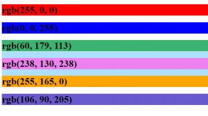 1 2 3 4 5 6 7 8 9 10 11 12 13 14 15 16 17 18 19 20 | <!DOCTYPE html> <html> <head> <meta charset="utf-8"> <meta name="description" content="css renkler"> <title>CSS Renkler</title> </head> <body> <h1 style="background-color:rgb(255, 0, 0);">rgb(255, 0, 0)</h1> <h1 style="background-color:rgb(0, 0, 255);">rgb(0, 0, 255)</h1> <h1 style="background-color:rgb(60, 179, 113);">rgb(60, 179, 113)</h1> <h1 style="background-color:rgb(238, 130, 238);">rgb(238, 130, 238)</h1> <h1 style="background-color:rgb(255, 165, 0);">rgb(255, 165, 0)</h1> <h1 style="background-color:rgb(106, 90, 205);">rgb(106, 90, 205)</h1> </body> </html> |