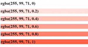 1 2 3 4 5 6 7 8 9 10 11 12 13 14 15 16 17 18 19 20 | <!DOCTYPE html> <html> <head> <meta charset="utf-8"> <meta name="description" content="css renkler"> <title>CSS Renkler</title> </head> <body> <h1 style="background-color:rgba(255, 99, 71, 0);">rgba(255, 99, 71, 0)</h1> <h1 style="background-color:rgba(255, 99, 71, 0.2);">rgba(255, 99, 71, 0.2)</h1> <h1 style="background-color:rgba(255, 99, 71, 0.4);">rgba(255, 99, 71, 0.4)</h1> <h1 style="background-color:rgba(255, 99, 71, 0.6);">rgba(255, 99, 71, 0.6)</h1> <h1 style="background-color:rgba(255, 99, 71, 0.8);">rgba(255, 99, 71, 0.8)</h1> <h1 style="background-color:rgba(255, 99, 71, 1);">rgba(255, 99, 71, 1)</h1> </body> </html> |