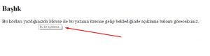 <!DOCTYPE html> <html> <body> <h2 title="Başlık">The title Attribute</h2> <p title="Bu bir açıklama ."> Bu kodları yazdığınızda Mouse ile bu yazının üzerine gelip beklediğinde açıklama balonu göreceksiniz. </p> </body> </html> |