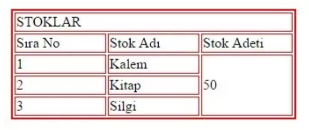 <!doctype html> <html> <head> <title>Tablo Uygulaması</title> <meta charset="utf-8"/> </head> <body> <table border=2 bordercolor="Red" > <tr> <td colspan="3" width="100">STOKLAR</td> </tr> <tr> <td width="100">Sıra No</td> <td width="100">Stok Adı</td> <td width="100">Stok Adeti</td> </tr> <tr> <td>1</td> <td>Kalem</td> <td rowspan="3">50</td> </tr> <tr> <td>2</td> <td>Kitap</td> </tr> <tr> <td>3</td> <td>Silgi</td> </tr> </table> </body> </html> |