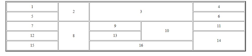 <!doctype html> <html> <head> <title>Tablo Örnekleri</title> <meta charset utf="8"> </head> <body> <table border="3" width="50%" height ="200" align="center"> <tr> <td align="center">1</td> <td rowspan="2" align="center">2</td> <td rowspan="2" colspan="2" align="center">3</td> <td align="center">4</td> </tr> <tr> <td align="center">5</td> <td align="center">6</td> </tr> <tr> <td align="center">7</td> <td rowspan="3" align="center">8</td> <td align="center">9</td> <td rowspan="2"align="center">10</td> <td align="center">11</td> </tr> <tr> <td align="center">12</td> <td align="center">13</td> <td rowspan="2"align="center">14</td> </tr> <tr> <td align="center">15</td> <td colspan="2" align="center">16</td> </tr> </table> </body> </html> |